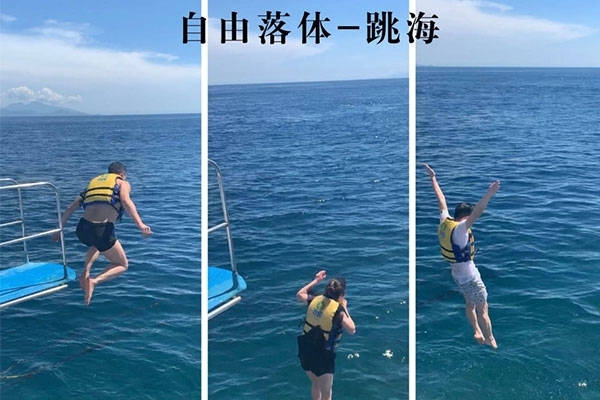 半小時后,我們首先到達了海中間由兩艘游輪搭建的漂浮“海上游玩基地”,除了“香蕉船”“甜甜圈”和“浮潛”這些項目,最有意思的是“跳海”,作為非專業隊員,大家入水姿勢各異,激起巨大的浪花。遺憾的是,“女神”曹總并沒有參與“跳海”,估計她是為大家著想,怕入水海平面升高2米,淹沒“基地”,多年以后,我還是要感謝曹總的“不淹之恩”,讓我依然可以坐在在夕陽下回憶往昔。