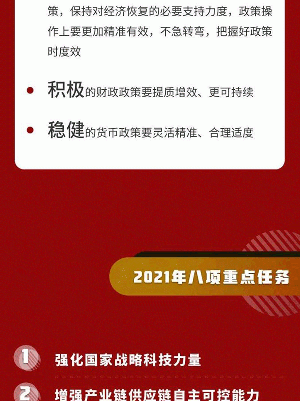 會議指出,明年宏觀政策要保持連續性、穩定性、可持續性。要繼續實施積極的財政政策和穩健的貨幣政策,保持對經濟恢復的必要支持力度,政策操作上要更加精準有效,不急轉彎,把握好政策時度效。要用好寶貴時間窗口,集中精力推進改革創新,以高質量發展為“十四五”開好局。積極的財政政策要提質增效、更可持續,保持適度支出強度,增強國家重大戰略任務財力保障,在促進科技創新、加快經濟結構調整、調節收入分配上主動作為,抓實化解地方政府隱性債務風險工作,黨政機關要堅持過緊日子。穩健的貨幣政策要靈活精準、合理適度,保持貨幣供應量和社會融資規模增速同名義經濟增速基本匹配,保持宏觀杠桿率基本穩定,處理好恢復經濟和防范風險關系,多渠道補充銀行資本金,完善債券市場法制,加大對科技創新、小微企業、綠色發展的金融支持,深化利率匯率市場化改革,保持人民幣匯率在合理均衡水平上的基本穩定。