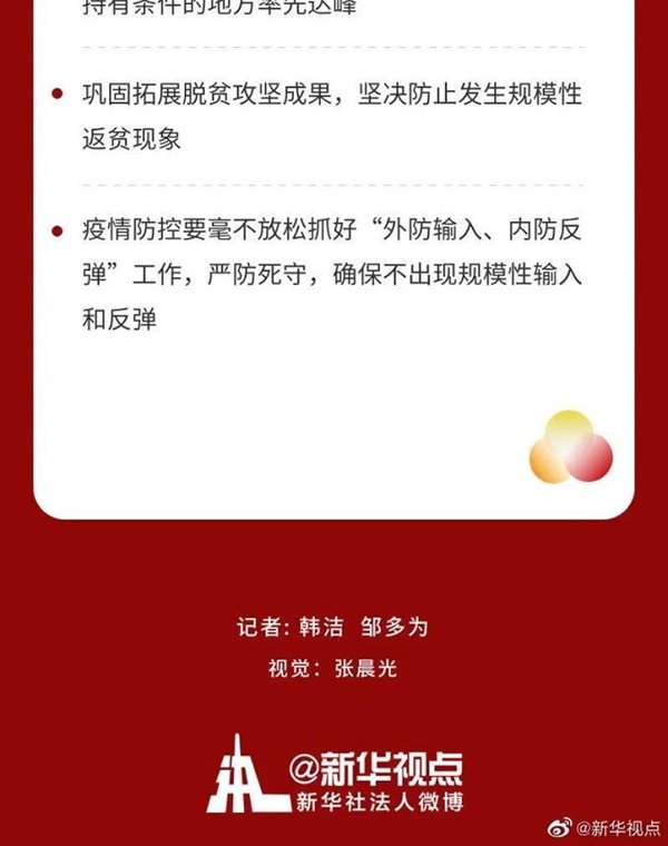 會議指出,在肯定成績的同時,必須清醒看到,疫情變化和外部環境存在諸多不確定性,我國經濟恢復基礎尚不牢固。明年世界經濟形勢仍然復雜嚴峻,復蘇不穩定不平衡,疫情沖擊導致的各類衍生風險不容忽視。要增強憂患意識,堅定必勝信心,推動經濟持續恢復和高質量發展。要辦好自己的事,堅持底線思維,提高風險預見預判能力,嚴密防范各種風險挑戰。要繼續高舉多邊主義旗幟,積極參與全球治理改革完善,推動構建人類命運共同體。